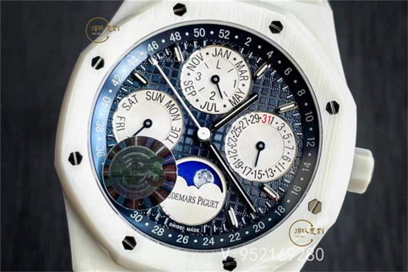 APS新品愛彼26579白陶瓷,皇家橡樹系列在“Grande Tapisserie”大格紋裝飾表盤上,日期、星期、月份、月相,和四個眼睛的位置與原裝同步,(區別普通版本四個眼鏡緊縮在一起)并以真實的月球圖像顯示天文精確月相,形成鮮明對比,直徑41mm,一體機5134自動上鏈機芯,厚度10.5mm(區別市面普通版本14mm )所有功能真實可用,更薄、更像 。