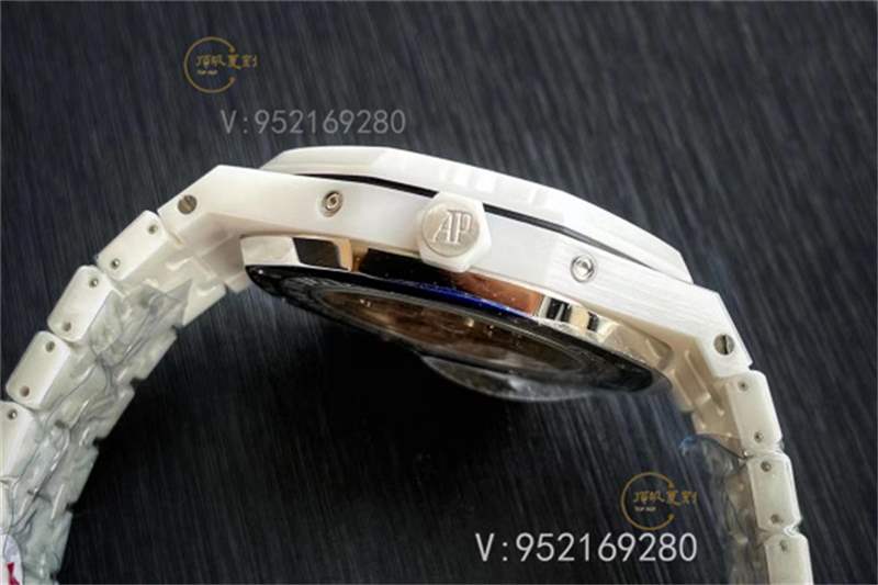 APS廠皇家橡樹萬年歷腕表選用了一體復刻機芯大大減少了厚度,APS廠版厚為10.5毫米,比正版僅厚了1毫米,基本上能夠忽略,APS廠與此同時也發布了金殼款,備受關注的乳白色陶瓷款也以上市。