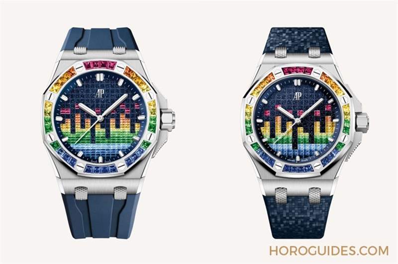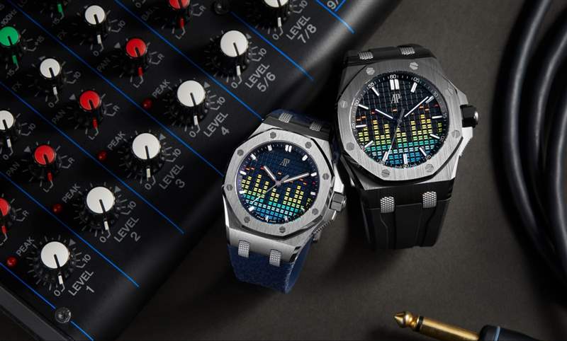 愛彼在這幾只限量表款的表盤大做音樂,在Tapisserie格紋表面加上移印的彩色均衡器圖案。從音樂里獲得的靈感,不止呈現在表盤上,處處藏著錄音室里可見的元素,好比滾花表帶接口模仿音響插頭,表冠護橋則令人聯想到混音器的推桿,轉換手法絕妙。
